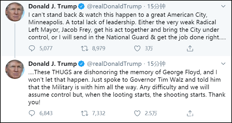 再看看在位的特朗普,沒有下跪,也沒有任何福利承諾給黑人同胞。只是在社交媒體上表達了對逝者的哀悼以及對鎮壓暴亂的警察表示尊敬,同時,也反覆強調會用軍事手段來穩定社會治安。