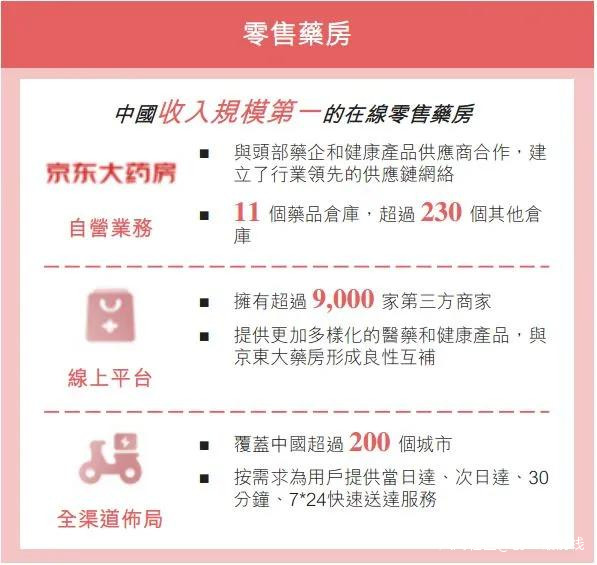 公開數據顯示,截至2020年6月30日,京東健康線上零售平台有超過1000萬種商品(SKU),入駐超過9000家第三方商家;在全國範圍內共有11個藥品專用倉庫和超過230個非藥品倉庫;O2O服務“京東藥急送”已覆蓋全國超過200個城市,提供最快30分鐘送藥上門的服務。