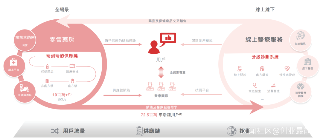 在京東健康400多頁的招股書中,“零售藥房及在線醫療健康服務業務協同的雙引擎”這一描述出現最頻繁。根據招股書介紹,京東健康的零售藥房業務和在線醫療健康服務協同整合,形成了“雙輪驅動”的業務模式。