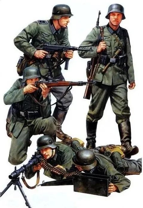 二戰德軍,稍微瞭解點軍事的人,都不難想起這樣的經典形象——大護耳頭盔,灰綠色軍裝,黑色軍靴,長柄手榴彈,98K步槍……