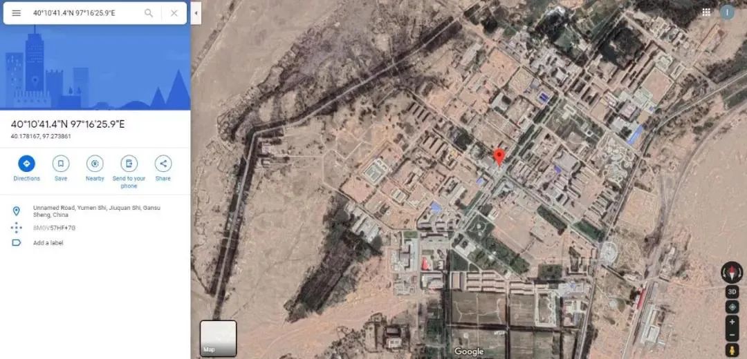 現在在谷歌輸入它的大致經緯度40°10'41.4"N,97°16'25.9"E,你能看到它被廣袤的戈壁灘包圍。
