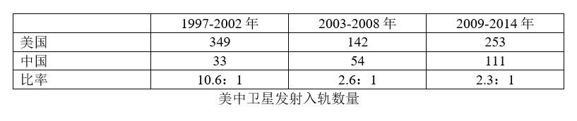 美國空間技術起步早,水平高,發射衞星數量一直高於中國。但2003年後,中國發射衞星數量明顯增加,與美國的數量差距大幅度縮小,此後數量差距繼續穩步縮小。美國衞星發射數量在2003-2008年期間大幅度下浮,2009-2014年期間大幅度回升,中國衞星發射數量大體同比增長,絕對數量的增長更加顯著。與2003-2008年期間相比,2009-2014年期間的中國衞星發射數量增加了一倍。