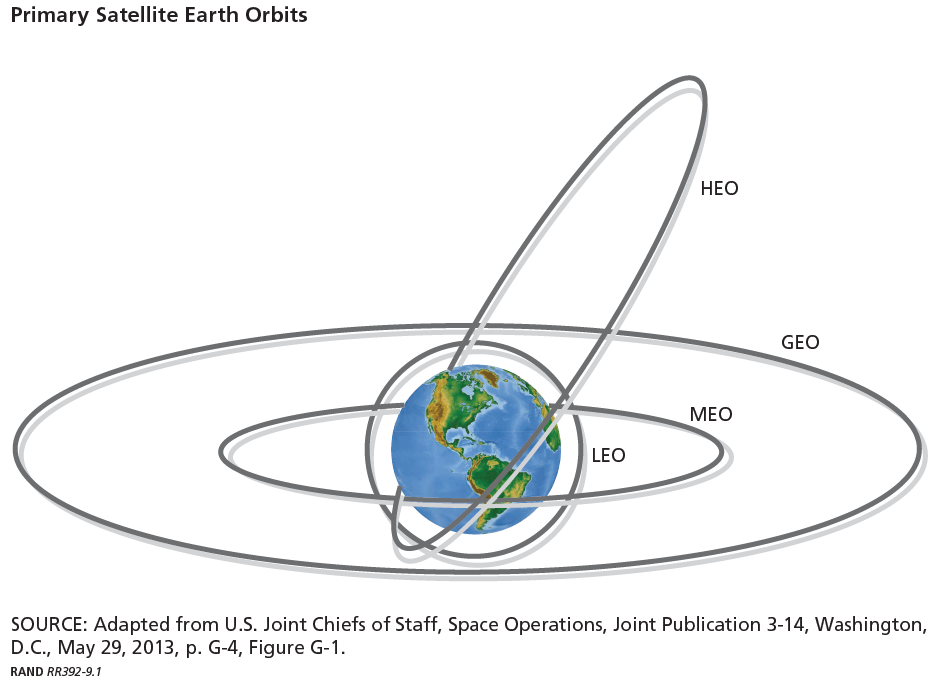 衞星軌道的不同通常揭示衞星的用途。低軌道(簡稱LEO)高度為300-2000公里,距離地球表面近,常用於ISR和氣象衞星。低軌道一般也是極地軌道,通過南北極,這樣在地球自轉下自然覆蓋全球範圍。如果還是太陽同步軌道,那衞星通過地球表面的任一點的時間相對於當地時間是固定的,因此日照角相同,尤其適合圖像偵察。高軌道離地球約36000公里,繞地球一圈週期為24小時。高軌道的軌道平面與地球赤道平面一致的話,衞星相對於地球表面的位置是固定的,所以更經常稱為地球同步軌道(簡稱GEO)。通信衞星、導彈預警衞星、北斗1衞星、部分氣象衞星等需要對地球凝視的衞星都在地球同步軌道,不過有些通信衞星用低軌道,可以大大降低對地面設備的天線要求。GEO和LEO之間是中軌道(簡稱MEO),典型高度為20000公里,繞地球一圈大約12小時,GPS和北斗2使用MEO。還有一種橢圓軌道(簡稱HEO,這裏HE是高度橢圓的縮寫)。GEO雖然提供對地球表面的凝視,但赤道軌道使得GEO衞星對高緯度地區的地面來説只有很低的視角(或者對於衞星來説具有較大的斜角或者側擺角),不利於發送和接受。HEO不是同步軌道,在向近地點運動時是加速運動,在向遠地點運動時是減速運動;在近地點近似於低軌道,在遠地點近似於GEO。HEO軌道平面傾角通常很大,甚至垂直(即極地軌道),而且呈很扁的橢圓狀,這使得衞星在向遠地點減速運動時,相對高緯度地區地面的角位移很小,幾乎有GEO的效果,特別適合用於高緯度地區的通信衞星或者空間監視。用於北極地區的話,近地點在面向南極一側,遠地點在面向北極一側;用於南極地區則相反。HEO是俄羅斯發明的,美國的空間紅外監視衞星(SBIRS)也用HEO。