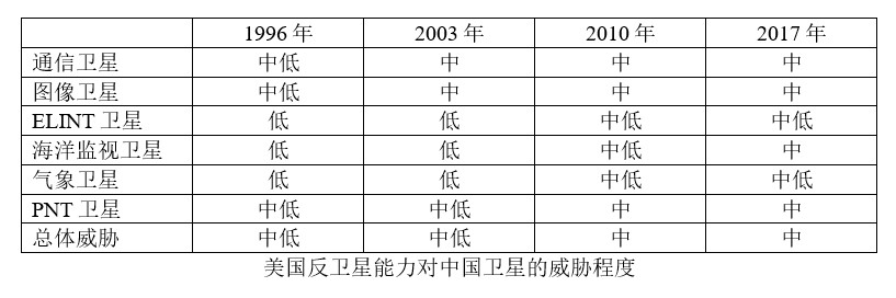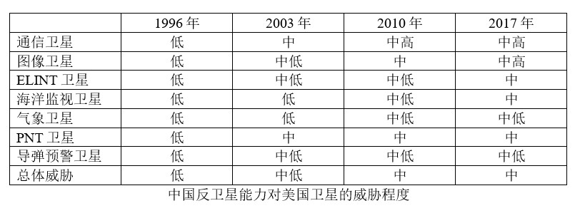 考慮到這些因素,蘭德認為,在1996年,中國對美國衞星的威脅微不足道;2003年中國威脅程度提高,但美國依然佔優;2010、2017年在總體上持平。