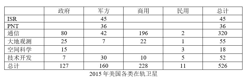 美國衞星的構成不一樣,絕大多數為通信衞星,凸顯美國對衞星通信的依賴。美國通信衞星絕大部分為商用,但除了軍方租用頻道,軍方也有專用通信衞星。就其他軍用衞星而言,ISR、PNT和通信相對均勻分佈。美國政府的大地觀測衞星大多用於氣象和環境監測,軍用氣象衞星(DMSP)的數據也從1998年起對民用和科研公開。