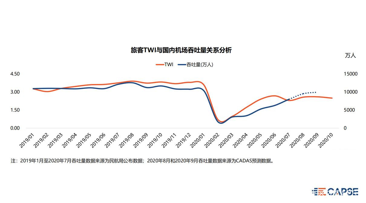 旅客出行意願指數(TWI)與國內機場吞吐量趨勢接近,旅客出行意願能夠較為準確的判斷吞吐量趨勢;10月份旅客TWI環比9月份下降4%。