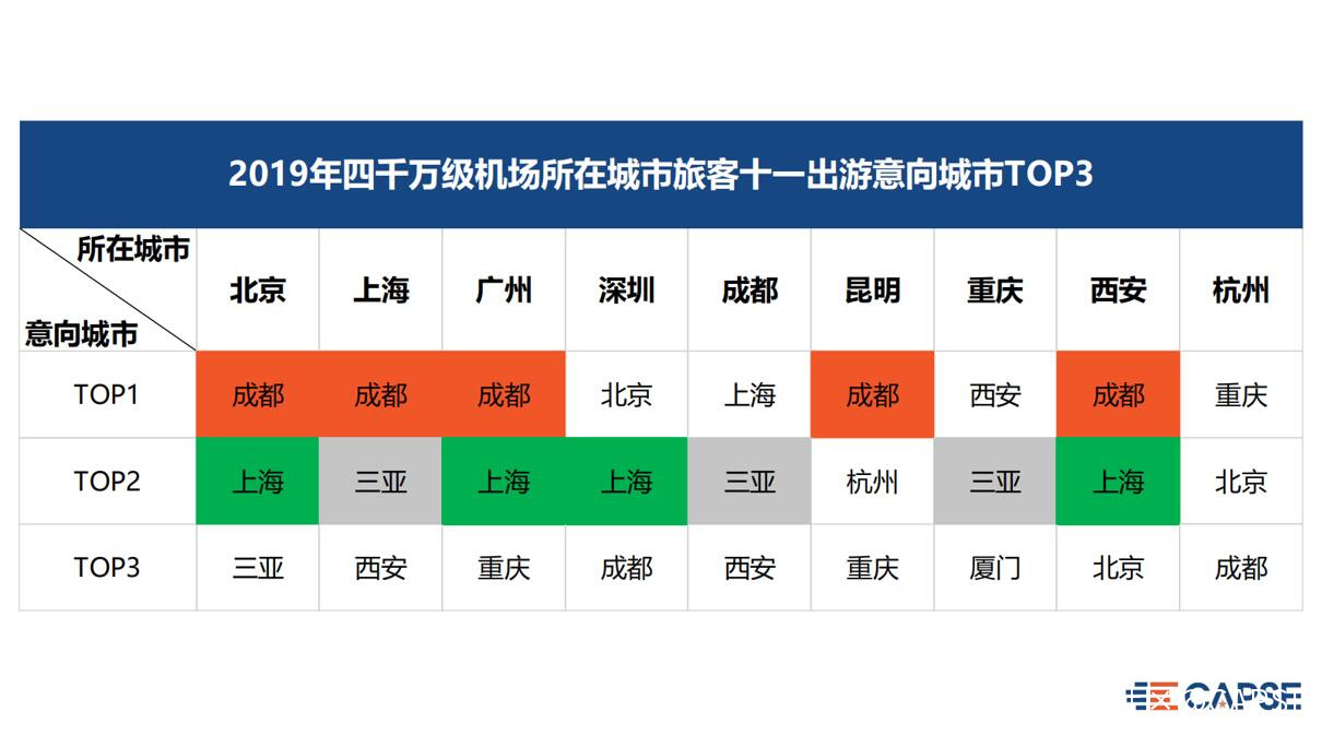 通過對2019年國內四千萬級機場所在的9座城市旅客出行意願進行分析: 8座城市中(除成都),有5座城市旅客出行首選是成都;上海和三亞是這些“大城市”旅客出行的“第二選擇”。
