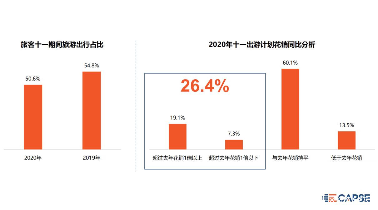 從旅客出行計劃和出行花銷來看,今年十一未見大面積“報復性消費”趨勢:出行計劃:今年十一有50.6%的旅客計劃旅遊出行,同比2019年十一下降4.2%;出行花銷:同比2019年十一,2020年十一旅客旅遊花銷趨於理性,6成旅客計劃與去年花銷持平,僅26.4%的旅客計劃旅遊花銷會超過去年。