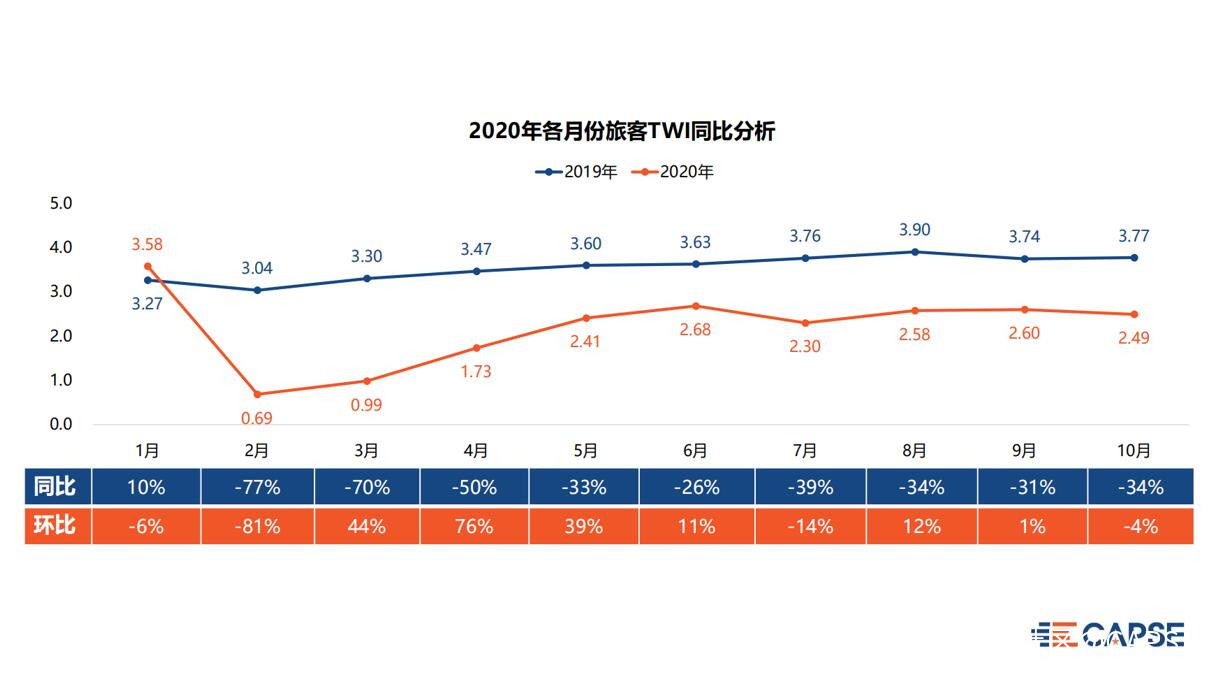 10月份旅客TWI同比降幅較9月份有所擴大,10月份旅客TWI同比下降34%,環比下降4%。