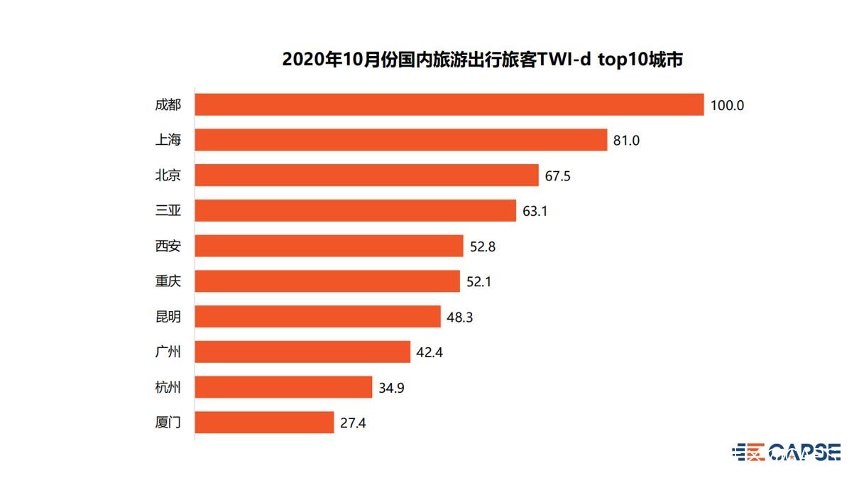 繼8月份和9月份後, 10月份成都仍是國內旅遊出行旅客首選目的地,上海取代三亞成為旅客國內旅遊出行主要目的地。