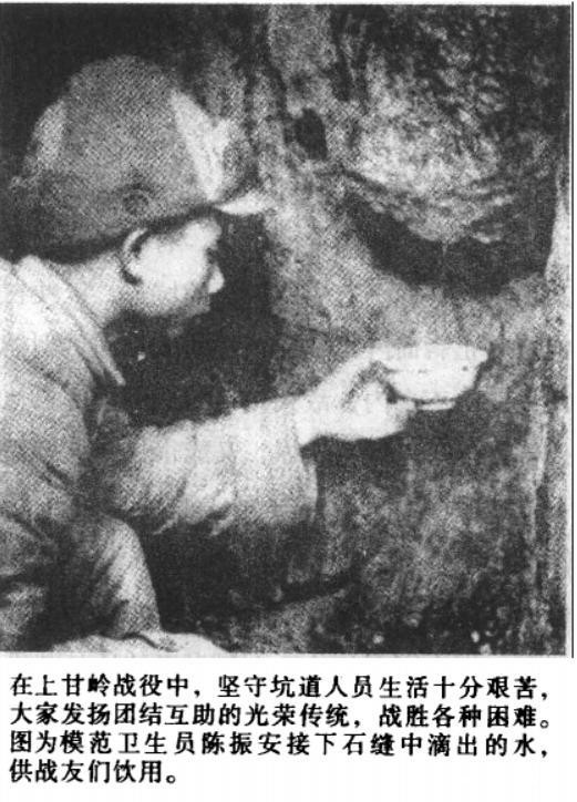 在這樣“送進一個蘋果”都難的困境下,“缺水”也成了戰士們的大考驗:最困難的時候,每個戰士每天只能分到半塊餅乾,由於缺水嚴重,戰士們吃餅乾時會把舌頭劃破。為了能讓傷病員們多喝一點水,衞生員們也在開動腦筋。石縫裏的點滴流水,都成了寶貴的資源。於是,就有了這張上甘嶺戰役最艱苦階段,衞生員陳振安“石縫找水”的照片——就是靠這些心酸的辦法,他一個人,就搶救了三百多名傷病員。