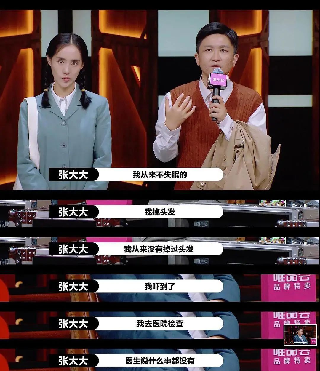 後面張大大解釋説是因為自己沒得選,被迫選的這個難度係數非常高的表演,像小學生做博士生的題,所以壓力大到掉頭髮、去醫院。