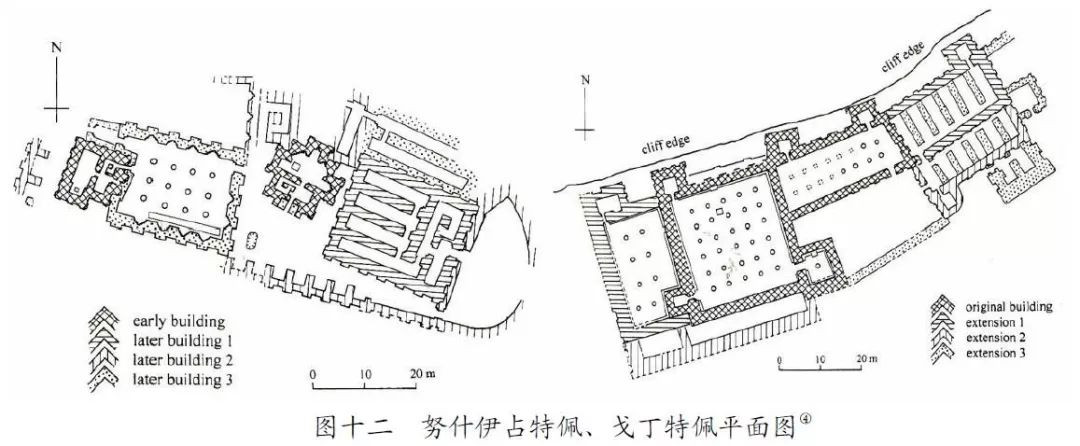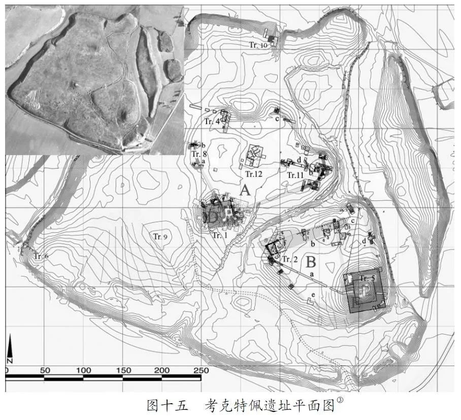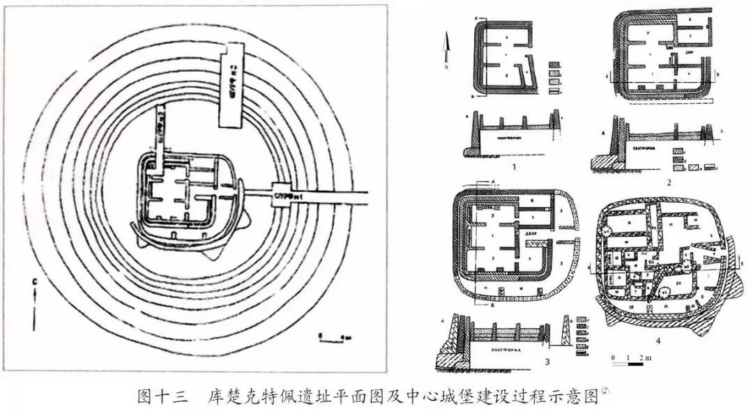 烏茲別克斯坦南部、巴克特里亞鐵爾梅茲地區的庫楚克特佩(Kuchuk tepe)遺址(見圖十三),坐落在一處平坦的圓形台地上,台地高約8米,面積約0.5公頃。台地中心有一座城堡,整體建在一個4米高的平台上,由四層防禦牆組成,其中內側三層均屬青銅時代晚期,從內向外依次修築。城堡最初佈局較為簡單,可能僅有比較單一的管理或軍事功能。修築第三層牆時,外壁略向外弧,第二、三層牆之間成為生活區域,東側開門。此後遺址一度被廢棄,大致在早期鐵器時代又被重新啓用,並加築了最外側第四道牆,同時牆內修建了大量建築,除生活居住外,還有進行經濟活動的場所。
