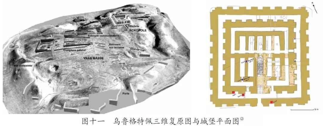 坐落於科佩特塔格山麓、阿爾丁與納馬茲加遺址中間的烏魯格特佩,是中亞鐵器時代最具代表性、發掘工作開展得較多的城址(見圖十一)。20世紀60年代末70年代初,蘇聯學者曾在這裏開了幾條探溝,建立了一個初步的年代框架;自2001年起,法國—土庫曼斯坦聯合考古隊在此進行了長期的發掘工作,對遺址有了較深入的認識。該遺址經歷了三個使用時期:銅石並用時期(公元前5000~前4800年)、青銅時代早中期(公元前3000~前2200年)和鐵器時代(公元前1500~前1000年)。青銅時代早期遺存主要分佈在台地北部,地層厚達七八米,表明人們在此長期定居;發現了土坯砌築、2米多寬的防禦牆和城門,門道與阿爾丁遺址十分類似。該遺址未發現青銅時代晚期的遺存,與整個中亞這一時期情況一致。此後,到了早期鐵器時代,該遺址又被重新利用:遺址東北部和東部發現有雅茲一期的生活設施,出土了手制彩繪陶器和一些輪製陶器;雅茲二、三期時期又興建了街道、城牆及一些建築。