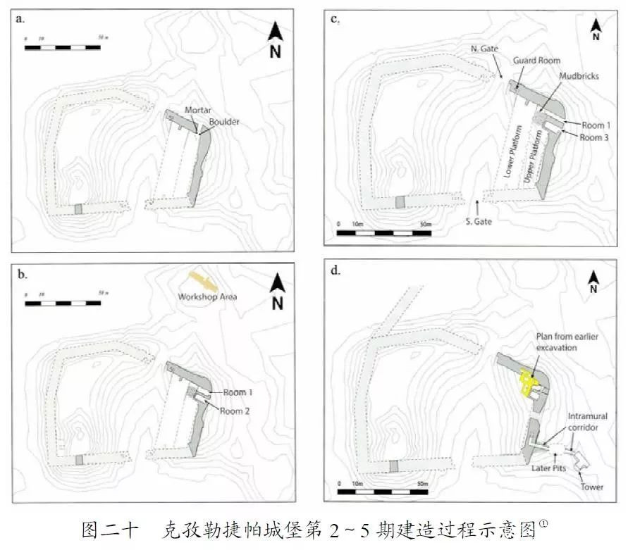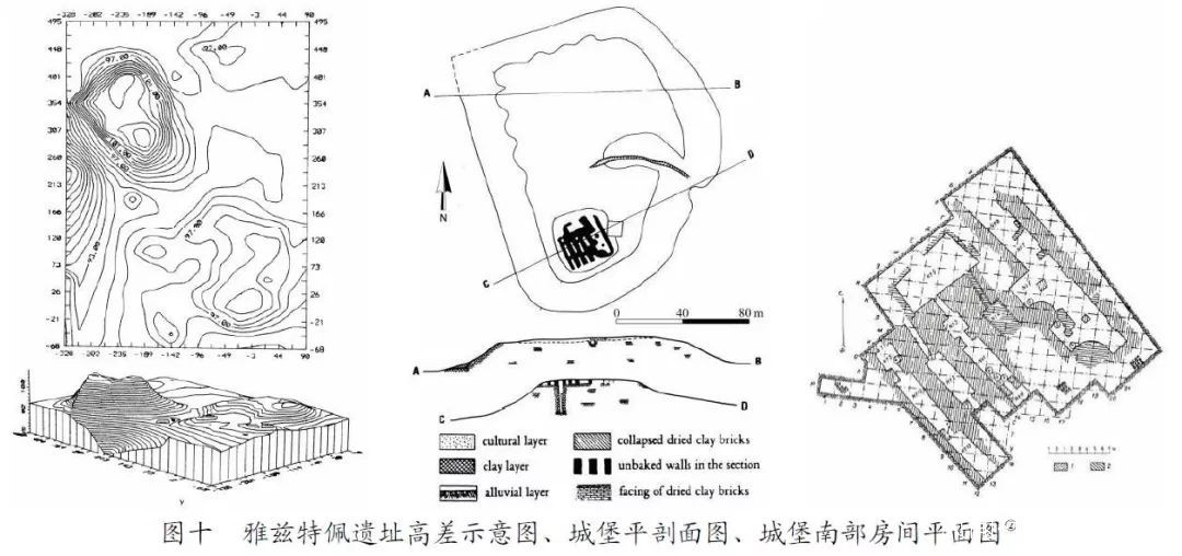 整個遺址分為城堡(citadel)和下城(lower town)兩部分。地層學信息表明,城堡與下城的佈局並非一次性規劃建造,而是逐漸形成的。發掘者將遺址形成過程分為五期(見圖二十)。第一期僅可見現城堡西南角的高台建築,規模很大,面積約120平方米,表面除炭灰之外別無他物,應是具有宗教性質的火壇。第二期緊鄰火壇外側修建起城堡,平面呈六邊形,東西長100、南北寬75米,南北各開一門,堡內中部較低,兩側較高,東牆內側以土坯壘砌兩層階地。第三期城堡外利用自然水道修建了壕溝,東牆內台地上修建了一些生活設施,同時北門外出現了青銅冶煉作坊。城堡在第三期末遭受一場大火,嚴重毀壞。火災之後不久在城堡之外修建了下城,即遺址的第四期。下城約呈平行四邊形,城牆隨自然地勢而建,東西長400米,南北寬300~325米,面積約13~14公頃,北部和西部被河水沖毀,東牆和東南角仍可見土坯砌築的牆體仍高達3米,外部修有向外突出的半圓形塔樓。城牆為雙層,外牆較薄、約0.7~1米厚,內牆厚約2米,內外牆之間留有2米左右寬的走廊。這種雙層牆是中亞青銅時代城址就形成的傳統。下城整體地勢較為低平,文化堆積豐富,發現了不少灰坑,但除了一些牆體和柱洞遺蹟,基本不見大型、結構複雜個人住宅或人口集中的生活街區等城市常見因素。第五期城堡和下城都未見有大的修築活動,遺蹟分佈範圍擴大,有些灰坑打破了城堡的牆體和地層,以及下城的外牆及塔樓。地表調查和試掘出土了大量石質鐮刀等生產工具和石磨、石杵、石臼等穀物加工工具,並通過浮選發現了小麥、燕麥、小米等植物樣本,表明該遺址是一處農業生產中心。城堡北門外的青銅作坊在第四期初停止生產,並用被粗布包裹緊密的陶土塊封閉,似有一定宗教意義。遺址中所出陶器大多屬於雅茲三期文化,從早期到晚期變化不大,第五期出現了希臘化類型陶器。結合測年數據,發掘者判斷遺址的絕對年代在公元前6世紀晚期到公元前4世紀末。