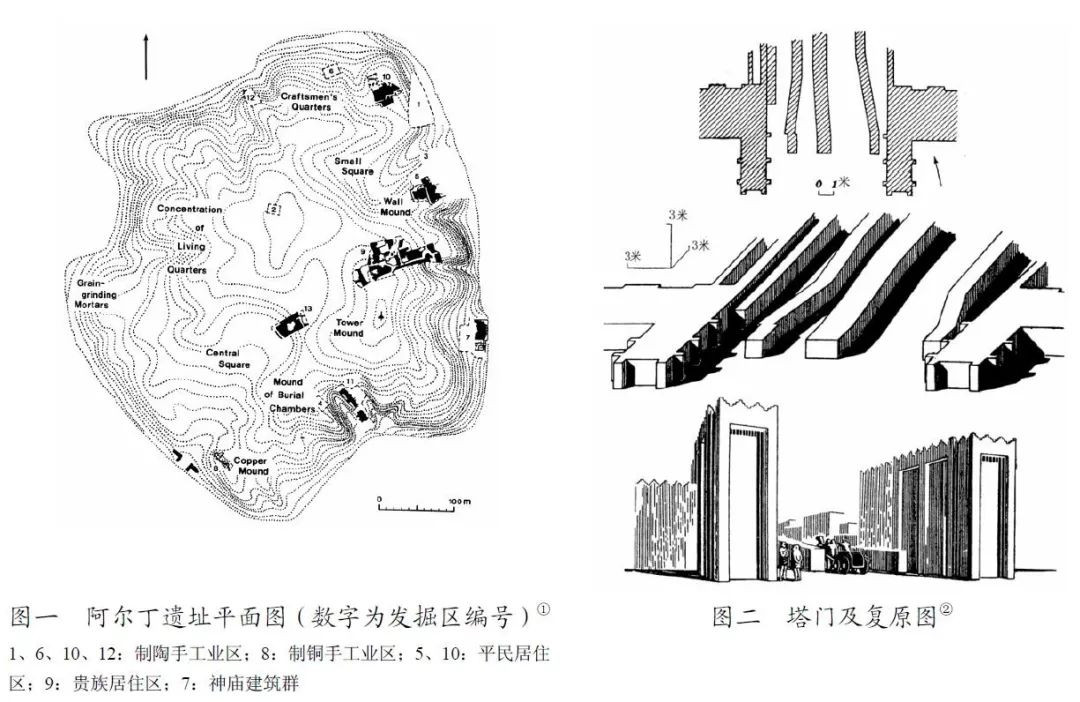 中亞地區最早的類似城市形態的遺址出現於青銅時代早期的土庫曼斯坦南部科佩特塔格山麓地帶,大約相當於公元前三千紀下半葉。典型遺址以阿爾丁特佩(Altyn tepe)、納馬茲加特佩(Namazga tepe)遺址為代表,均為平面呈圓形的大型聚落,二者分別佔地26公頃和70公頃,聚落內部已經發展出較為複雜的結構,有了不同的功能分區,被稱為原始城市(proto-urban)。這些原始城市的出現是植根於本地的農業灌溉經濟基礎上、適應社會組織結構自然發展分化的結果。以阿爾丁遺址(見圖一)為例,該遺址可分為神廟區、貴族居住區、平民居住區、不同的手工業生產生活區、農業區等,表明該遺址已經出現了不同社會階層和人羣集團的差別,成為一個複雜的社會有機體,而不再僅僅是一個大型農業生產中心,但尚未進入城邦國家的階段。遺址不同區域修築有防禦牆,並以矩形塔加固,南部第8、11號發掘區還修築有高大的塔門(見圖二),門道比遺址內部街道更寬,一方面具有防禦功能,另一方面表明已出現能夠組織較大規模人力的上層人羣。宗教建築羣集中在遺址的東南部,規模不小,由此推測這裏的神權與世俗權力可能相互有所牽制。