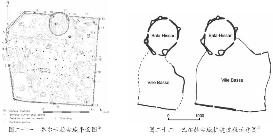 馬爾吉亞那的埃爾克卡拉古城,在公元前3世紀被塞琉古王朝安條克一世擴建為一座希臘化城市喬爾卡拉(Gyaur Qala),前者成為城堡,兩側連接着後者的北牆(見圖二十一)。在帕提亞和薩珊時期,該城持續繁榮,並一直延續着城堡與下城的格局,直到伊斯蘭時期在周圍大規模修築新城才逐漸衰落,但並未完全廢棄,甚至在蒙古人入侵之後和帖木兒時期,也斷續有人在此居住。