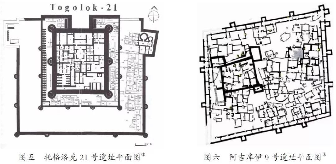 值得注意的是,古諾爾南丘(見圖四)與北丘兩座遺址、託格洛克21號遺址(見圖五)、阿吉庫伊9號遺址(見圖六)的多重城牆中,均以內城城牆最厚,牆體上均加築有方塔或圓塔,顯然表明內城等級較高,可能是該遺址的高等級居民區或管理機構所在。古諾爾北丘的發掘者直接將其稱之為“宮殿”。還有研究者將阿吉庫伊9號遺址的內城與中亞地區歷史時期流行的“卡拉(Qala/Kala)”聯繫起來,認為前者是後者的初期形態,並且可能是當地中世紀政治經濟制度中的封建領主形式的萌芽。