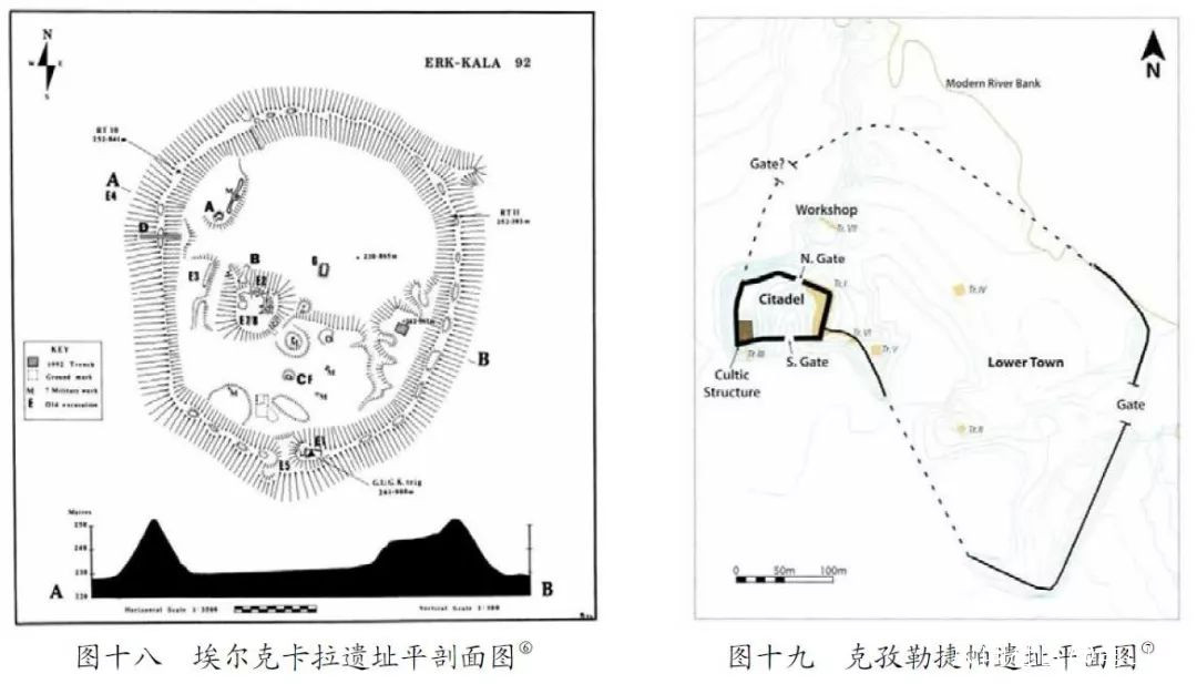 馬爾吉亞那的埃爾克卡拉(Erk Kala)古城(見圖十八),位於今土庫曼斯坦馬雷市東北約25公里,被認為是阿契美尼德王朝在馬爾吉亞那興建的行政中心。該城平面呈橢圓形,東西長約400米、南北約500米,佔地面積20公頃,南部開門,周圍環繞的防禦牆高達23~27米。城北部較低窪,中間略偏西南的高顯土丘上建有一城堡(citadel),直徑約50米、高在25米以上。中央土丘南部的地層堆積厚達17米,延續使用了約1500年,其中最早的地層疊壓於生土之上,厚達2.5米,年代約在公元前8~前7世紀,出土物中最早可見雅茲一期文化的陶片;中央土丘北側的斜坡則發現有高約15米的人工平台,由長方形土坯壘砌而成。在人工平台上構築城堡,這是早期鐵器時代城址的顯著特色,由此推測,埃爾克卡拉城址在成為阿契美尼德行政機構之前已存在了相當長時間。