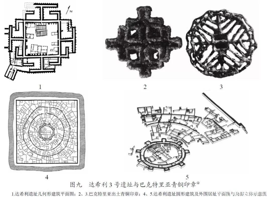 達希利遺址(見圖九)位於阿富汗朱茲詹(Jowzjan)省阿姆河南岸,範圍很大,在100平方公里內分佈着41處遺址,年代上至青銅時代、下到貴霜時期。其中1號和3號遺址屬於青銅時代,大約相當於公元前三千紀晚期到二千紀中葉,均為設防聚落,而3號遺址的兩座大型建築又尤為特別。一座略呈長方形,建築範圍長88米、寬84米,中間由長廊圍成長38米、寬40米的內庭;內庭中有幾組房間,四邊外又各建一組平面呈T和L形的長廊,平面構成一個複雜的幾何圖形,無疑是一次性規劃建成的;外牆還裝飾有壁柱;發掘者認為其性質是宮殿。另一座建築平面呈圓形,直徑40米,外圍為兩道牆垣組成的長廊、並隔出大小不同的空間,牆外加築9座方塔。牆內有若干房間,但不見生活用品,有些房間建有火壇,一些火壇還建在磚砌高台上,有些甚至保留着火燒灰燼。圓形建築之外呈放射狀密集地分佈着大量居址,有道路與其聯通。這些居址中還修有兩道圓形圍牆,與中心建築形成同心圓,整個建築羣之外又有方形圍牆與壕溝環繞。發掘者認為中心的圓形建築是一座火神廟,周圍居民由宗教權力管理和統領。這兩座建築的平面形制十分奇特,尤其是方形宮殿的T形走廊十分狹窄、幾乎無法通過,而且幾乎沒有出土物和使用痕跡,發掘者將它們與當地出土的一些幾何形青銅印章聯繫起來,認為它們可能都具有宗教上的象徵意義。