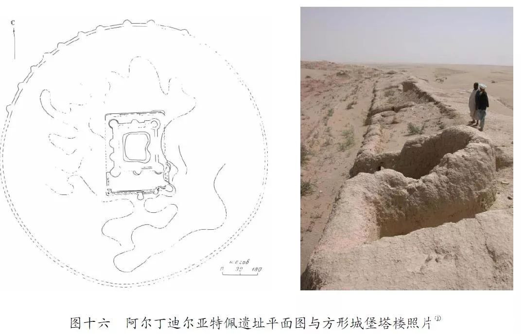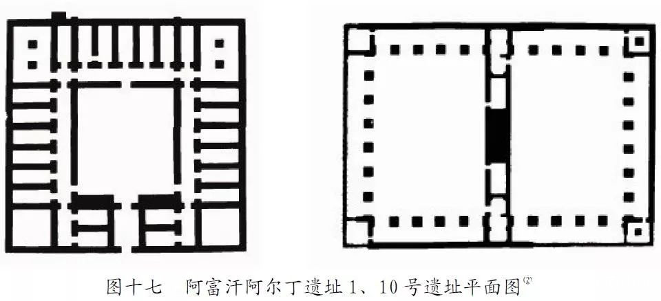 位於阿富汗北部城市巴爾赫以北、阿姆河以南22公里處的阿爾丁迪爾亞特佩(Altyn Dilyar Tepe)遺址(見圖十六),平面略成圓形,直徑約670米,佔地面積約15公頃,四周環繞圍牆,保存最高處約8米,遺址中間方形城堡高達28米、四邊均有突出的半圓形塔樓。該遺址西南約30公里的阿爾丁(Altyn)遺址,由一系列土墩組成,其中最大的兩處建築編號為1號和10號(見圖十七),分別被稱為冬宮和夏宮。1號建築平面方形,邊長約36米,中間為庭院和水塘,四邊排列窄長房間,其前部以一條長走廊相連,四角房間呈正方形,其中兩間還有立柱支撐,所有建築牆壁都有雪花石膏層裝飾。這種窄長房間佈局與烏魯格特佩類似,應是伊朗西部建築傳統的餘緒。10號建築總長80米、寬55米,中間由一組長條形石質建築分隔為兩個院落,內側有柱廊,四角還裝飾壁龕。阿爾丁迪爾亞特佩和阿爾丁兩處遺址出土陶器表明,其年代應在阿契美尼德王朝之前,建築規模宏大,證明巴克特里亞已出現了王權國家。