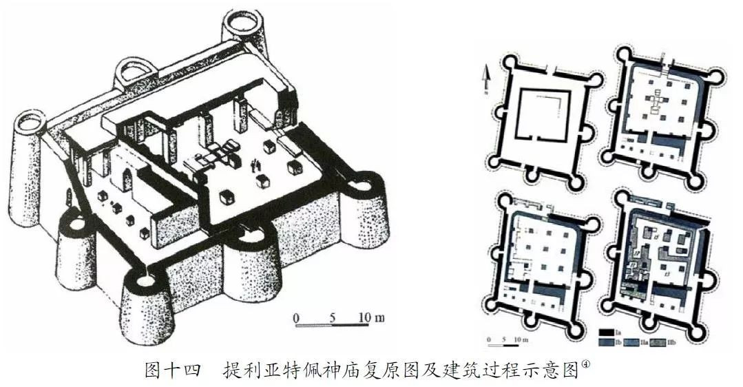 此外,阿富汗北部的提利亞特佩(Tillya tepe)城堡亦屬這一時期巴克特里亞地區的代表建築。與庫楚克特佩類似,該城堡也修建在一座高6米的平台上,平面呈平行四邊形,長36、寬28米。外牆十分厚重,約建於公元前二千紀中葉,四角和每邊中部各建有圓形塔樓。城堡中心最初是一座方形建築,大約公元前1300年左右被拆除,新建了兩個彼此相連的立柱大廳,其中北側廳較大,面積約400平米,由9根立柱支撐,中間還修建了一座火壇,因此發掘者認為該建築是一座火神廟(見圖十四)。此後,神廟又經過幾次修築和改建,但基本格局保持不變。