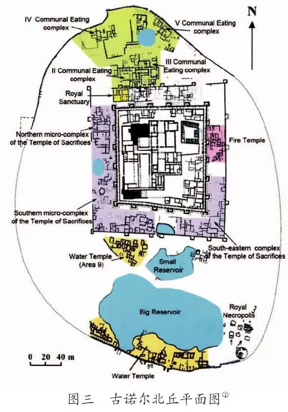 古諾爾特佩由南北兩個土丘組成,兩丘均有城牆環繞,內部建築的性質功能存在差別,表現出較為複雜的社會結構。北丘(見圖三)佔地約15公頃,從內到外共三重城牆:內城每邊約長120米,牆上開有三角形射擊孔,四邊和轉角處均有方形瞭望塔,牆內修出連接各塔的走廊;中牆亦有方塔,內、中兩重牆之間密集地修建了各種宗教性建築;中、外牆之間的建築集中在南北兩處,北部為生活區,南部有水塘、高等級墓地和另兩座神廟;最外層城牆大體呈橢圓形,防禦性略弱,僅有拱壁而沒有修建方塔。南丘規模小於北丘,共有內外兩重城牆,牆上均修築有圓形塔樓,內城可能是宮殿;內外牆之間有神廟、平民住宅等建築。
