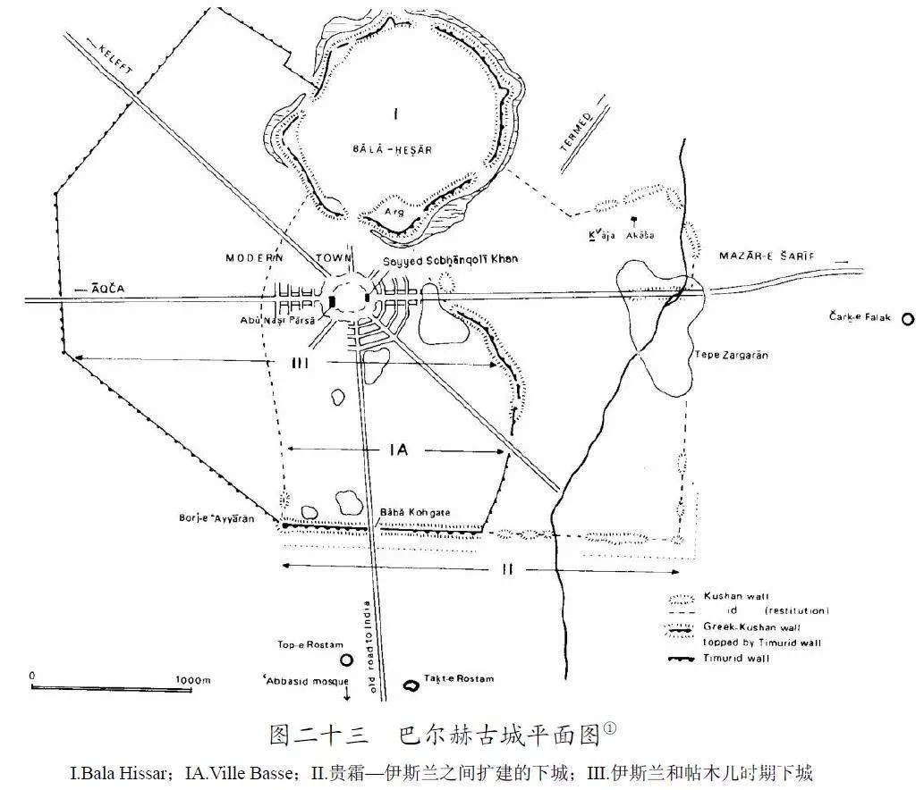 巴爾赫古城(見圖二十二)經歷了類似的擴建過程,只是年代上晚得多。這座古城位於阿富汗北境馬紮裏沙里夫城西北約23公里,總面積達到550公頃。其城堡稱為巴拉·希薩(Bala Hissar),佔地150公頃,平面呈橢圓形,城牆仍保留着20多米高,外有突出的塔樓,從形制判斷可能始建於阿契美尼德王朝時期,但已發掘的地層最早僅到公元前3世紀的塞琉古王朝時期。希臘化時代晚期—貴霜時期在城堡外南部擴建了下城,名為維爾·巴斯(Ville Basse),將前者作為城堡。下城在貴霜之後和伊斯蘭征服之前又一度再向東擴張。帖木兒王朝時期也曾對城堡和下城最初的城牆進行大規模增築(見圖二十三)。