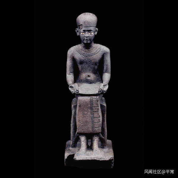 伊姆霍坦普Imhotep。青銅 盧浮宮博物館,巴黎,公元前12世紀。在他的膝蓋紙莎草紙上銘刻他的名字。