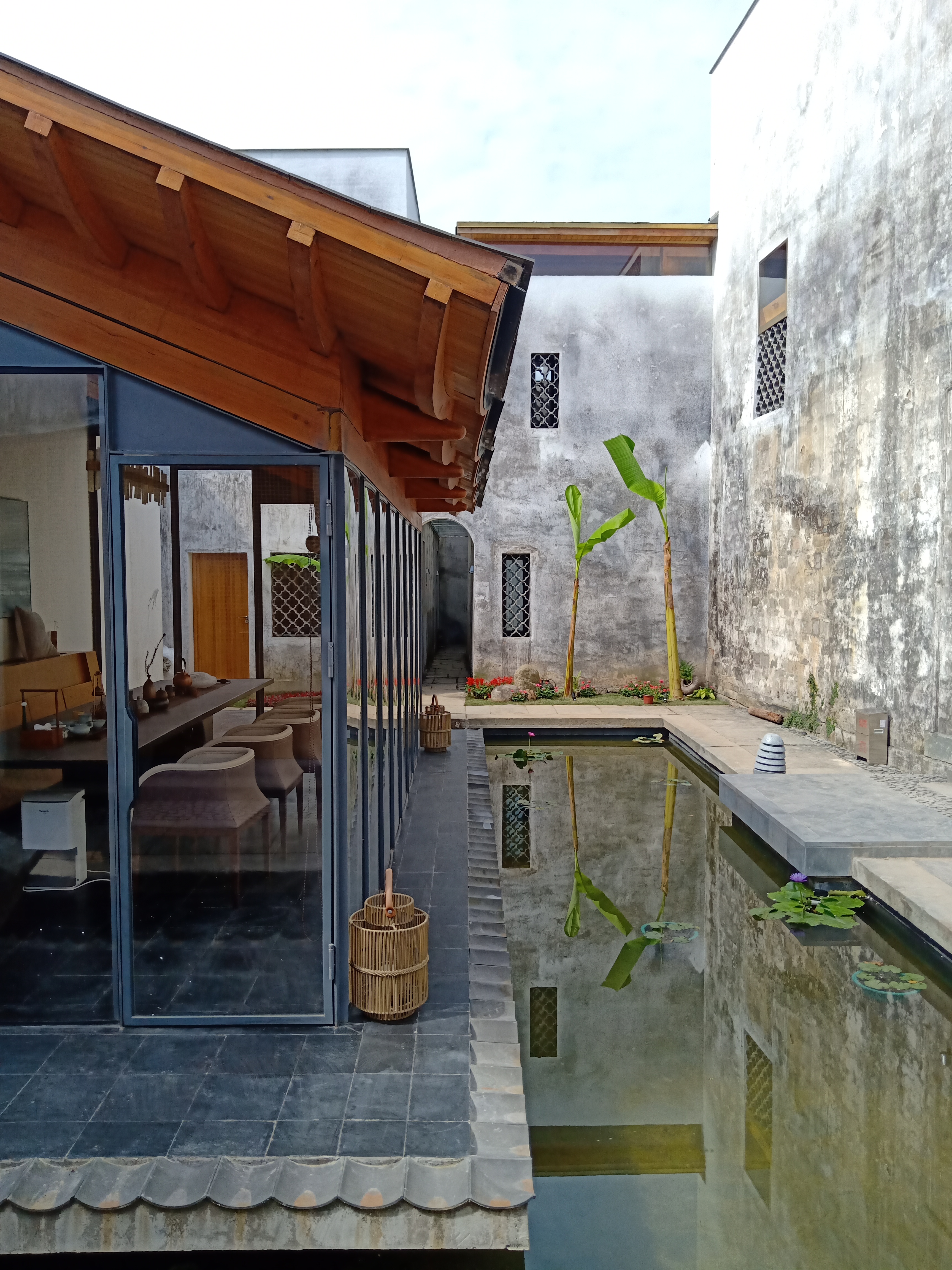 不過一進房間就感覺這個酒店非同一般。到了第二天白天出來,更是發現這個民宿實在是世外桃源般雅緻。整個民宿包括室內的每一個裝飾一看就是名家精心設計的作品,不亞於四星級以上酒店的內部配置。酒店名字南山客棧,令人想起悠然見南山的詩句,此處風景的確與陶淵明的詩很貼切。