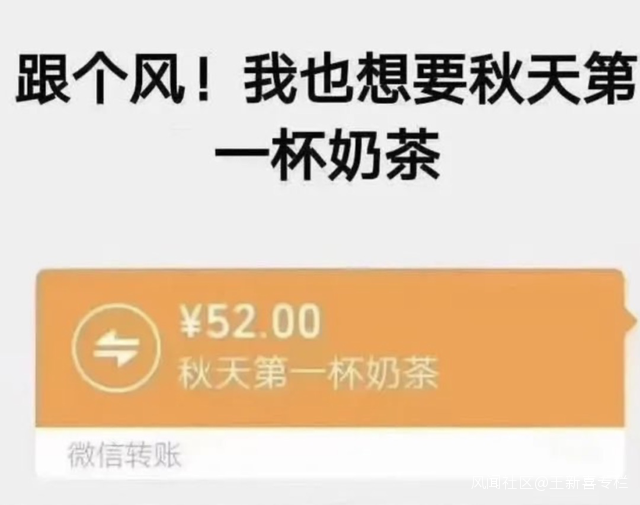 但也容易讓我們想到“口紅效應”——每當經濟不景氣的時候,口紅的銷量反而會直線上升。女士們收到了對象的“秋初奶茶”52元紅包,不僅成功地在朋友圈主動秀了一波恩愛,也為對象省了一筆錢,當賺錢能力和購買能力下降的情況下(從520元到52元,秋後的第一個奶茶紅包本質是520的秋後閹割版),“秋天的第一杯奶茶”其實也是一種“廉價的非必要物”。