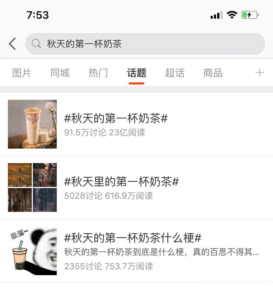 目前微博話題詞#秋天的第一杯奶茶#閲讀量高達23億,超91.5萬次討論,抖音上相關視頻超過25萬條。