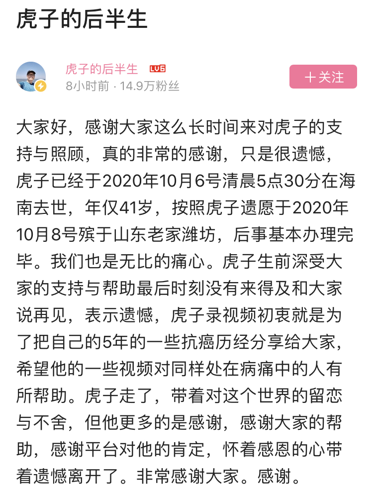 【文/觀察者網 嚴珊珊】10月9日,曾被質疑“賣慘騙錢”的抗癌博主“虎子的後半生”賬號發佈訃告,證實該博主已於10月6日在海南去世,年僅41歲。