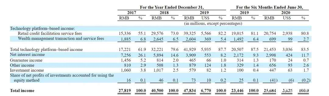 脱鈎P2P業務的陸金所將自身定義為“技術驅動型個人金融服務平台",以零售信貸和財富管理為主要業務,但是在2020上半年,財富管理業務貢獻收入佔比僅2.7%,同比下滑53%。零售信貸服務貢獻收入在今年上半年佔比80.81%。而零售信貸服務本身似乎並沒有脱離P2P的內核,實際上陸金所的業務收入來源仍是以放貸為主,其他理財產品等盈利變現並不明顯。