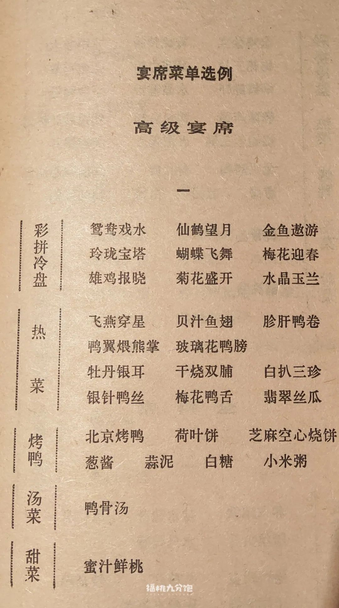 當時的高級宴席,規格是9個彩拼冷盤,11個熱菜,一套烤鴨,一個湯,最後一道甜品。