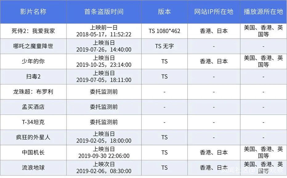 2019年侵權量TOP10電影首條盜版鏈接信息