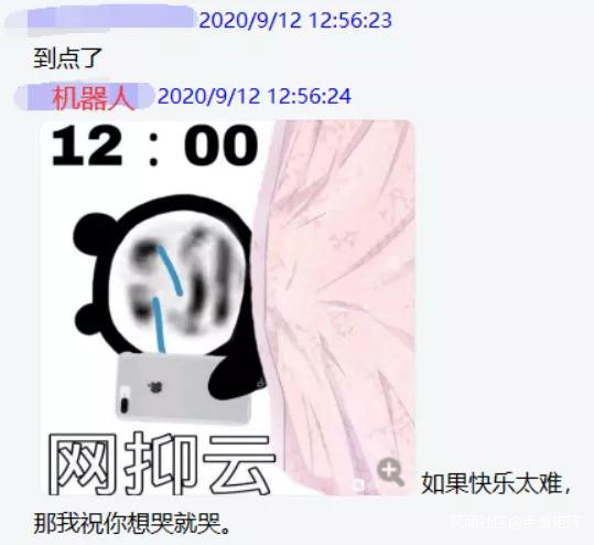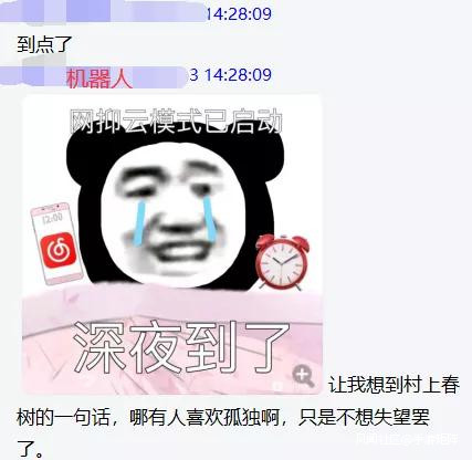 在8月開始,網絡上開始出現大量關於“網抑雲”的玩梗段子和表情包,近期一些QQ聊天羣的機器人也跟上了網絡熱點,安裝上了“網抑雲”功能,只要在羣裏發一句“到點了”,機器人就會自動回覆一段所謂的“網抑雲”經典語錄配上相關表情包,羣友們玩得不亦樂乎。