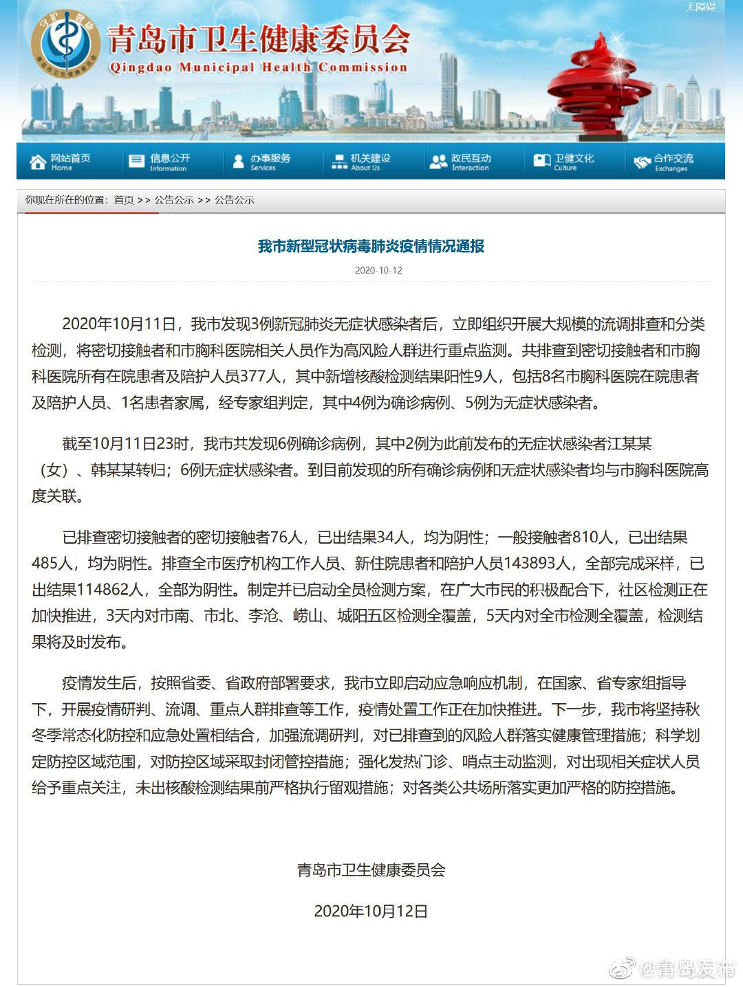 已排查密切接觸者的密切接觸者76人,已出結果34人,均為陰性;一般接觸者810人,已出結果485人,均為陰性。排查全市醫療機構工作人員、新住院患者和陪護人員143893人,全部完成採樣,已出結果114862人,全部為陰性。制定並已啓動全員檢測方案,在廣大市民的積極配合下,社區檢測正在加快推進,3天內對市南、市北、李滄、嶗山、城陽五區檢測全覆蓋,5天內對全市檢測全覆蓋,檢測結果將及時發佈。