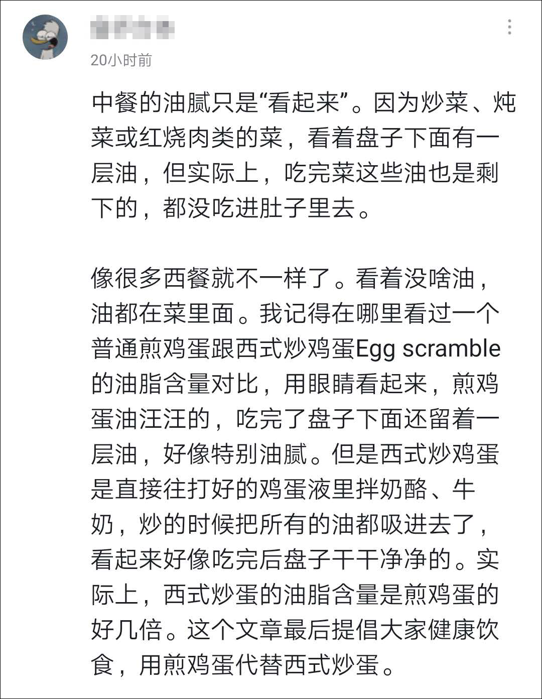 有人覺得我們中餐只是看起來油膩,實際上油都在菜湯裏了,吃不到肚子裏。