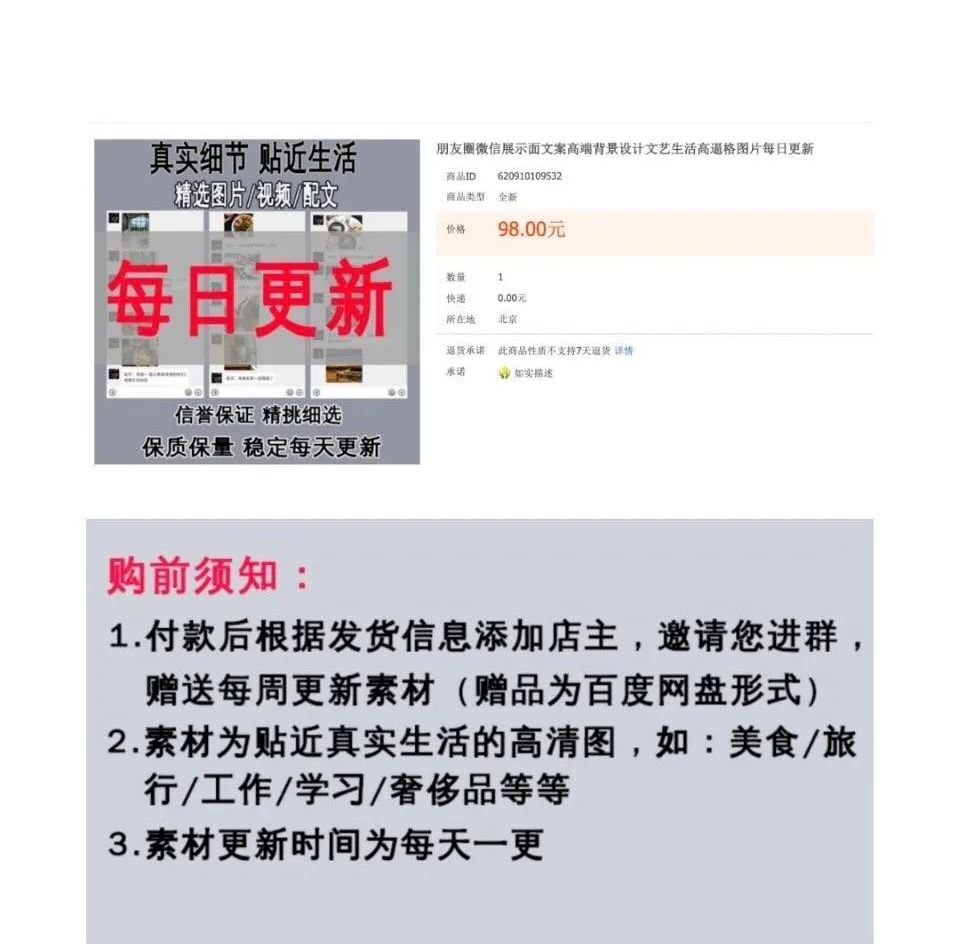 公眾號“廢品加工站”起底了淘寶“高端朋友圈”的生意。拍下訂單後店家會邀請進羣,每日定時更新涵蓋美食、健身、奢侈品、工作、夜生活、旅遊等主題的圖片和配文。
