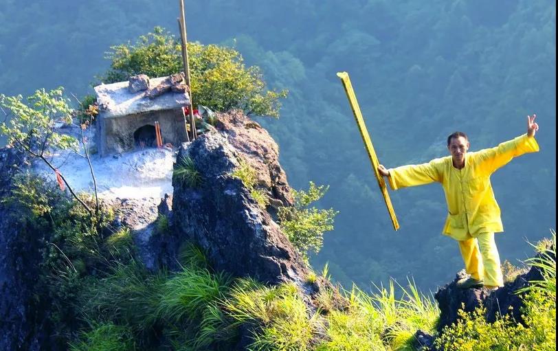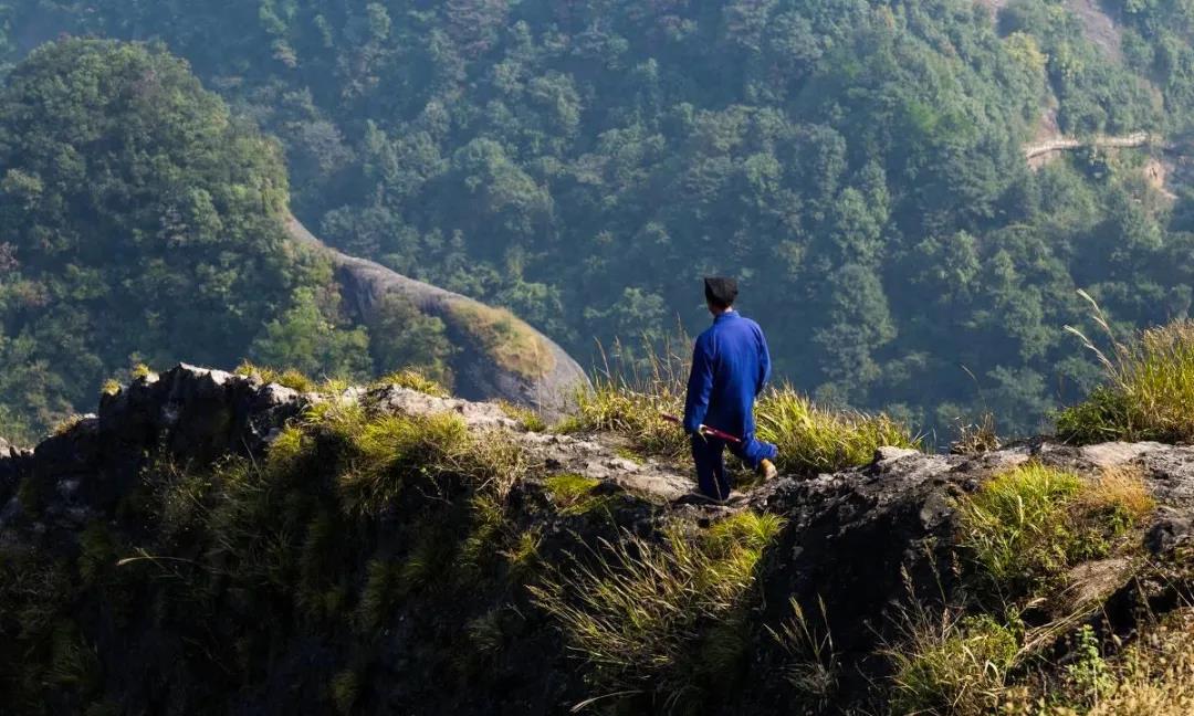 身穿深藍色道袍的男子唸完咒,右手握着一根雨傘長的香,轉身向懸崖邊上走去。