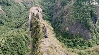 武當山龍頭香那塊石樑僅僅懸空伸出約3米,八角寨的這個龍頭香卻得穿過50米長的小徑,左右兩邊都是萬丈深淵。從上面鳥瞰,這裏就像是一把刀刃直插在懸崖峭壁,最窄的地方只有10公分。