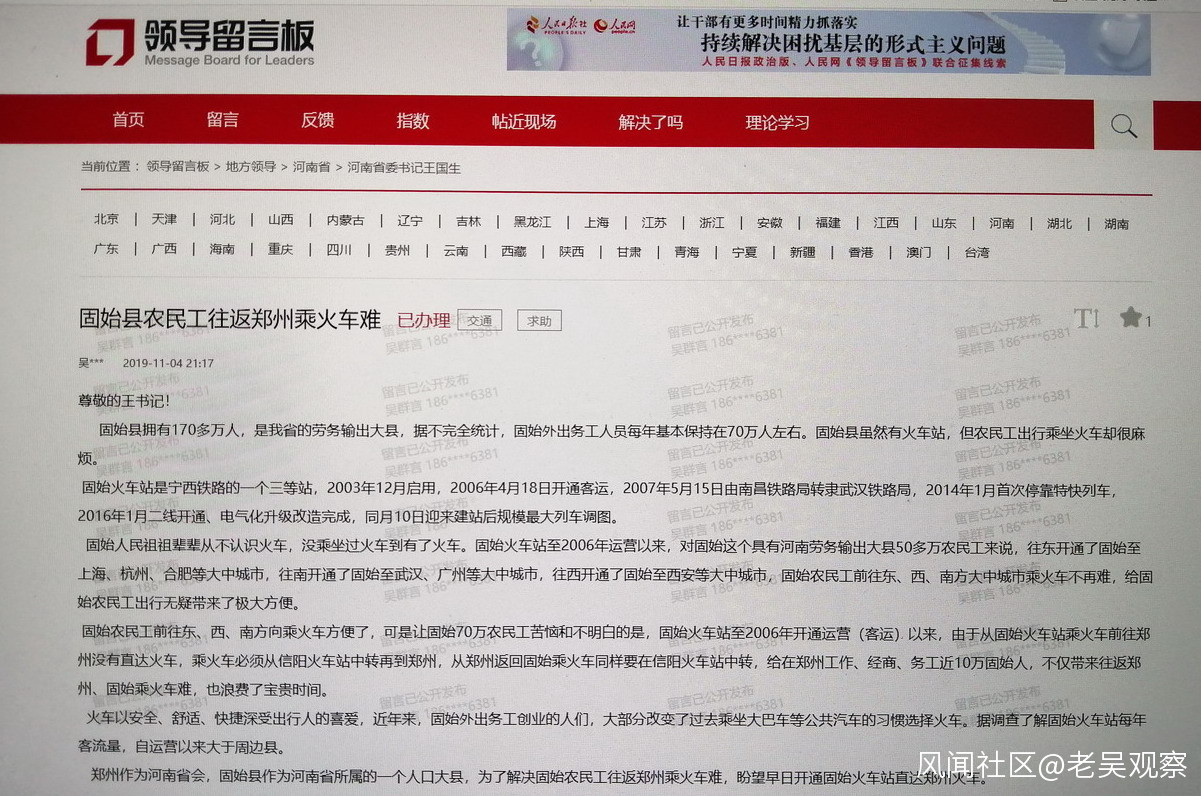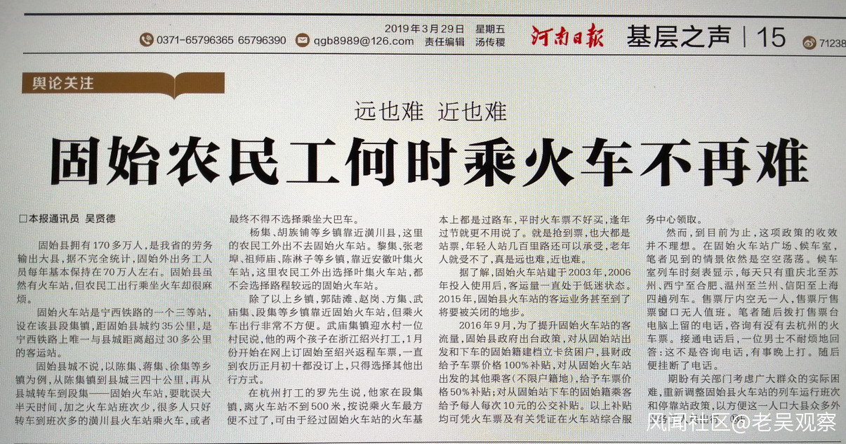 農民工吳賢德兩年4次撰文呼籲開通固始直達鄭州客運列車_風聞