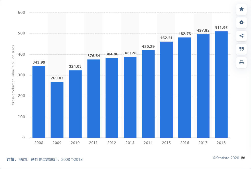 從總產值來看,2018年德國汽車行業總產值5115.9億歐元(4萬多億人民幣),約佔當年GDP的15%。