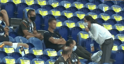 當時在看比賽的C羅一度忘記把口罩戴好,有工作人員看到後便上前提醒,C羅也很快做出反應,拿起放在身旁的口罩重新戴好觀賽。