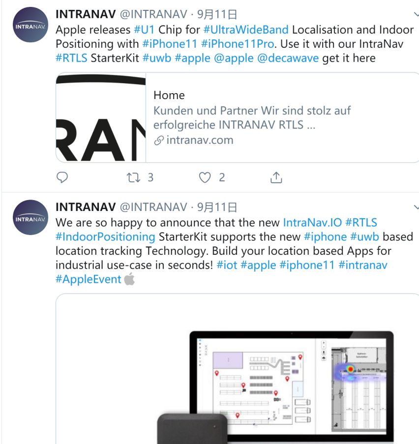 去年,在蘋果公司的產品發佈會後,基於Decawave芯片DW1000的定位廠商INTRANAV連發兩條推特,聲稱其套件支持與iPhone11的互操作,Decawave也轉發了該推特。這説明,蘋果U1有極大的可能支持IEEE 802.15.4。