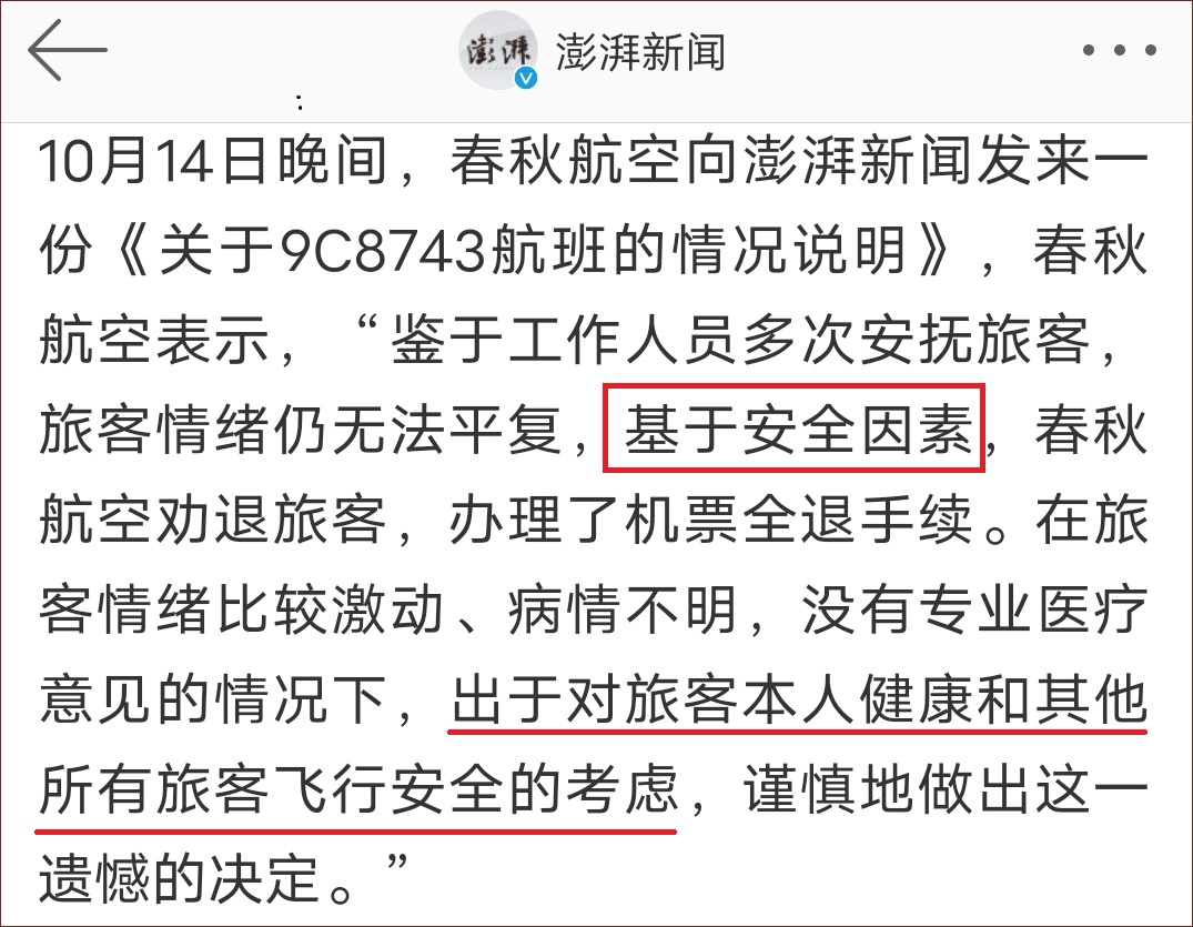 10月14日晚間,春秋航空通過澎湃新聞,發佈了《關於9C8743航班的情況説明》: