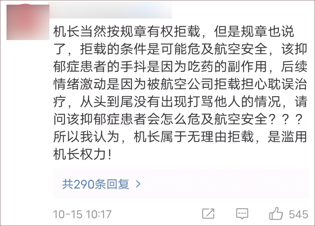 有網友譴責,機長拒載的前提是“可能危及航空安全”。抑鬱症患者怎麼危機航空安全?