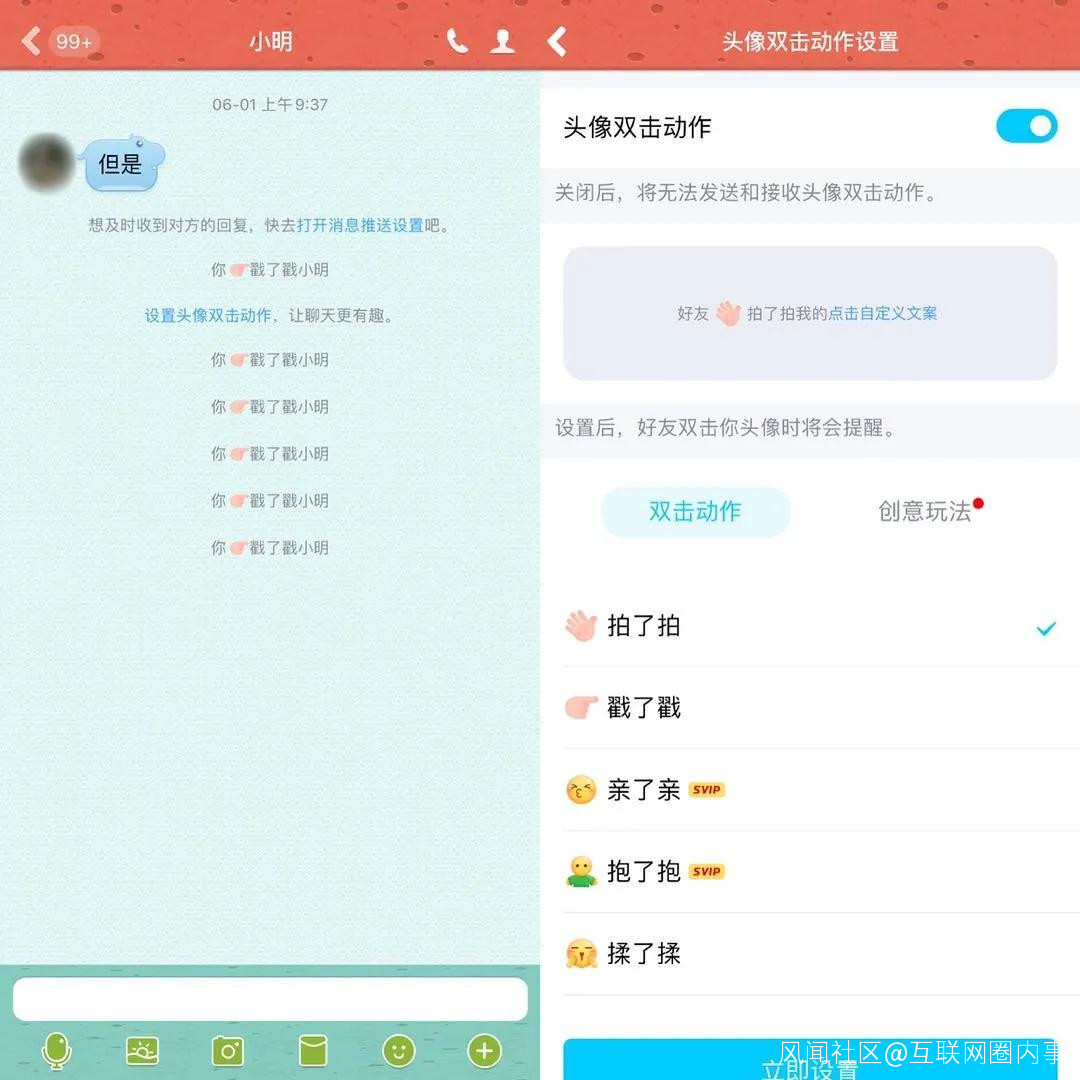 雖然QQ在大方向上極力走和微信不同的道路,但在一些細節上,還是無可避免地和微信趨同化了,兩個產品經常互相借鑑。比如微信前不久上線的拍一拍功能,其實是QQ早就上線的「雙擊動作」。而QQ,也繼微信推出接龍功能之後,推出了和接龍本質一致的「一起寫」功能。