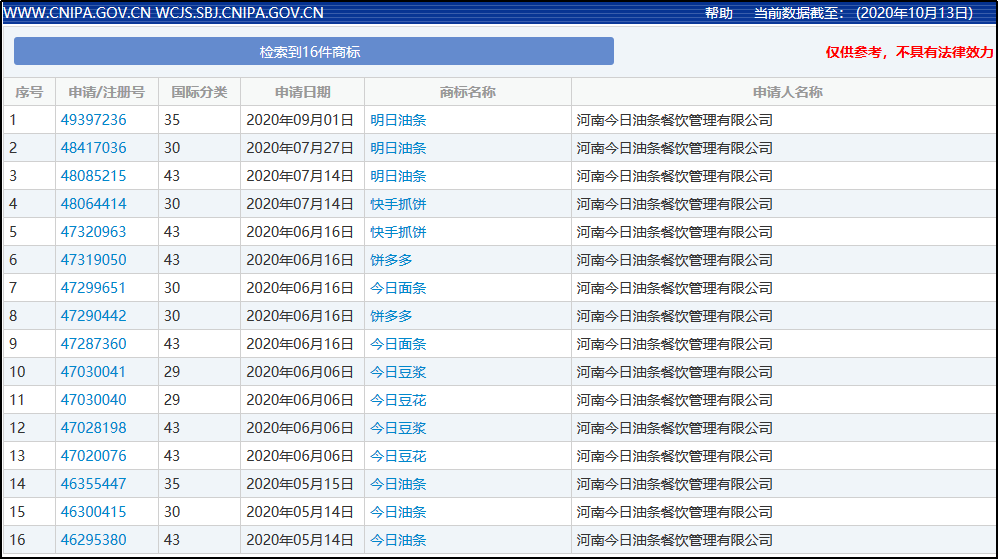 其中,“今日油條”商標申請於5月14日,恰好是這家公司領取營業執照的第二天。